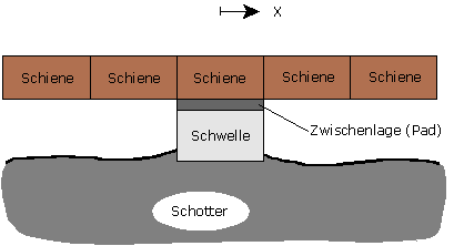 Programmtechnisch wird die Substruktur aus 5 Teilstücken (4 x Schiene, 1 x Schiene mit Pad, Schwelle und Schotter) gebildet (Bild 2), die sich natürlich auch in unterschiedlichen Reihenfolgen zusammen setzen lassen. Dadurch entstehen insgesamt 5 verschiedene Möglichkeiten des Lastangriffs innerhalb des Schwellenfachs, eine begrenzte aber doch ausreichende Anzahl.