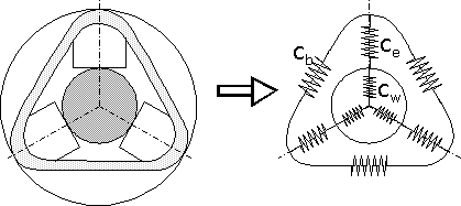 | Bild 1: Die auf die Einzelteile des Futters wirkenden Fliehkräfte haben zur Folge, daß die Kontaktstelle zwischen Werkstück und Spannbacke entlastet wird. Die Spannkraft sinkt. |