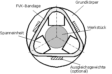 Die Fliehkräfte der Backen erzeugen in der Bandage eine Zugbeanspruchung. Die in Umfangsrichtung angeordneten Fasern sind daher besonders wirksam, wodurch sich insgesamt eine sehr hohe Steifigkeit erzielen läßt. Gleichzeitig läßt die geringe Dichte von Faser- und Matrixwerkstoff erwarten, daß die Bandage selbst nur geringen Fliehkräften ausgesetzt ist.